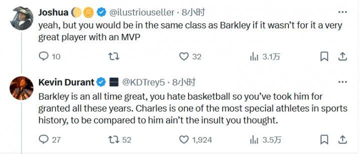 网友:没冠军你也就是个巴克利 杜兰特:巴克利没你说的那么差